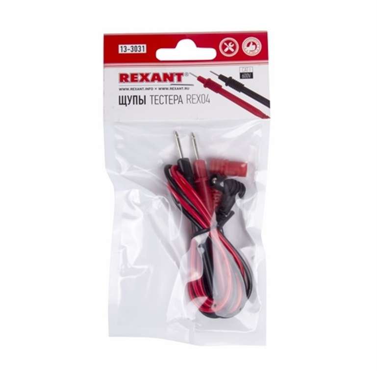 Щупы REX04 Rexant для тестера и токовых клещей. Они подсоединяются к гнездам мультиметра, для удобства имеют разные цвета: черный и красный. Как правило, черный щуп подключается на общее гнездо, а красный на гнезда "+". Клеммы, провода и ручки щупов надежно изолированы для защиты пользователя от поражения электрическим током. Для удобства работы металлические концы щупов заострены.